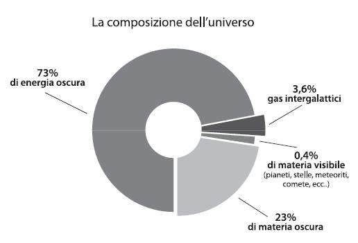 73% de energía oscura 3,6% gases intergalácticos 0,4% de materia visible (planetas, estrellas, meteoritos, cometas, etc) 23% de materia oscura Con los términos Materia Oscura y Energía Oscura (aquí encuentras un informe ad hoc: Le WIMP en italiano) se indican las casuas de efectos gravitacionales (o contra-gravitacionales) de múltiples fenómenos astronómicos no imputables a masas o fuerzas “visibles”. Por mucho tiempo se ha creído que cada objeto presente en nuestro Universo era visible en cuanto capaz de emitir (o reflejar) luz que, llegada a la Tierra, pudiese ser relevada recogiendo de ella informaciones sobre el objeto o bien propiedades generales sobre el Cosmos. Pero justamente después del análisis de la luz proveniente del cosmos en años de observación, hoy sabemos que el 90% de la materia presente en el cosmos está compuesta por objetos o por partículas que no pueden ser vistas: en otros términos, la mayoría de la materia cósmica no emite luz (o mejor, radiación), por lo tanto puede ser relevada sólo por los efectos que provoca sobre la materia visible. Esta "masa faltante" es llamada Materia Oscura, un nombre que apunta a su característica fundamental: la invisibilidad. ¿Por qué la Materia Oscura debe existir? Hay dos razones fundamentales que llevan a hipotizar la existencia de una cantidad notable de materia no visible, claramente no porque sea vista, sino porque los efectos que determina en sus objetos cercanos. razón 1: Los