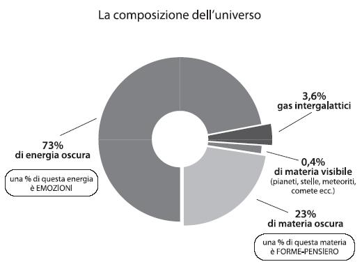 ![]() El valor con el cual cada objeto de la galaxia se mueve respecto a su centro, depende de la distancia del objeto del centro de la galaxia y de la masa que constituye a ambos: en efecto, para mayor masa y para menor distancia tenemos interacciones gravitacionales de mayor intensidad (como cuando se acerca un imán a un trozo de hierro). De eso se deduce que a una masa galáctica más grande corresponderán velocidades mayores. Pero también en este caso los valores de las velocidades medidas son demasiado elevados para justificar la cantidad de materia visible presente en la galaxia. Este es el segundo motivo por el cual parece que deba existir una cantidad notable de materia oscura, pero con potentes repercusiones gravitacionales, que provoca el valor observado de las velocidades elevadas de los objetos presentes. Además, a tales velocidades debería seguir el fenómeno del alejamiento de los cuerpos de los brazos por efecto centrífugo, cosa que en cambio no ocurre como consecuencia de estos efectos gravitacionales “ulteriores”. En cada caso se desprende, como dijimos antes, que sistemas constituidos sólo por Materia Oscura no son relevables si cerca no hay sistemas visibles que sufran sus efectos. ![]() Esta Materia Oscura y esta Energía Oscura tienen que ver también con las EMOCIONES y más precisamente con las emociones negativas o con lo que nosotros conocemos como el CUERPO EMOCIONAL. Este es un pasaje que tenemos que entender bien dado que es fundamental en relación a nuestro discurso para la realización del concepto de inmortalidad; el punto es que las emociones están en relación con masas o formas-pensamiento de las cuales nuestros cuerpos físicos están rodeadas y que las llevamos con nosotros como globos o como una nubecita de Fantozzi (famoso actor italiano). Por lo tanto, la tabla de la composición del universo que vimos antes puede ser afinada así: ![]() La composición del